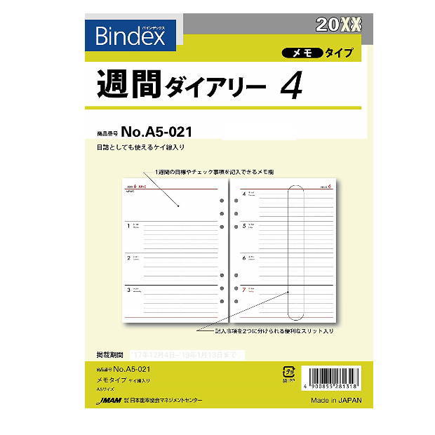 商品名 週間ダイアリー4 メモタイプ(罫線入り) A5サイズ リフィル Bindex バインデックス システム手帳 ダイアリーリフィール 品番 No.A5-021 サイズ 縦210×横148mm (A5サイズ、デスクサイズ 6穴) 仕様 見開き1週間(罫線入り) 年間カレンダー、年間計画表、月間テーマ、年齢早見表、度量衡換算表、 掲載期間 2018年12月3日〜2020年1月12日 メーカー JMAM (株)日本能率協会マネジメントセンター 書き込みやすく日誌としても使える罫線入り、見開き1週間タイプの日付入りリフィル ※店頭及び他のモールと在庫を共有しておりますので、掲載中の商品でも欠品の場合がございますのであらかじめご了承ください。