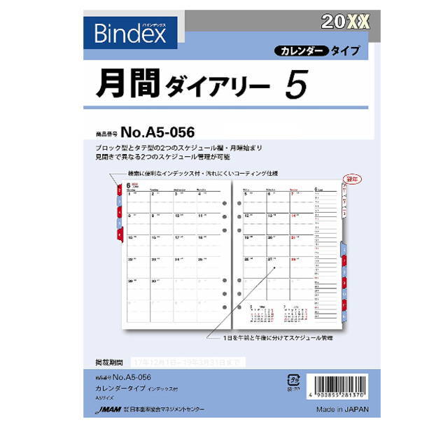 システム手帳リフィル 2019年 A5サイズ 月間ダイアリー5 バインデックス A5-056